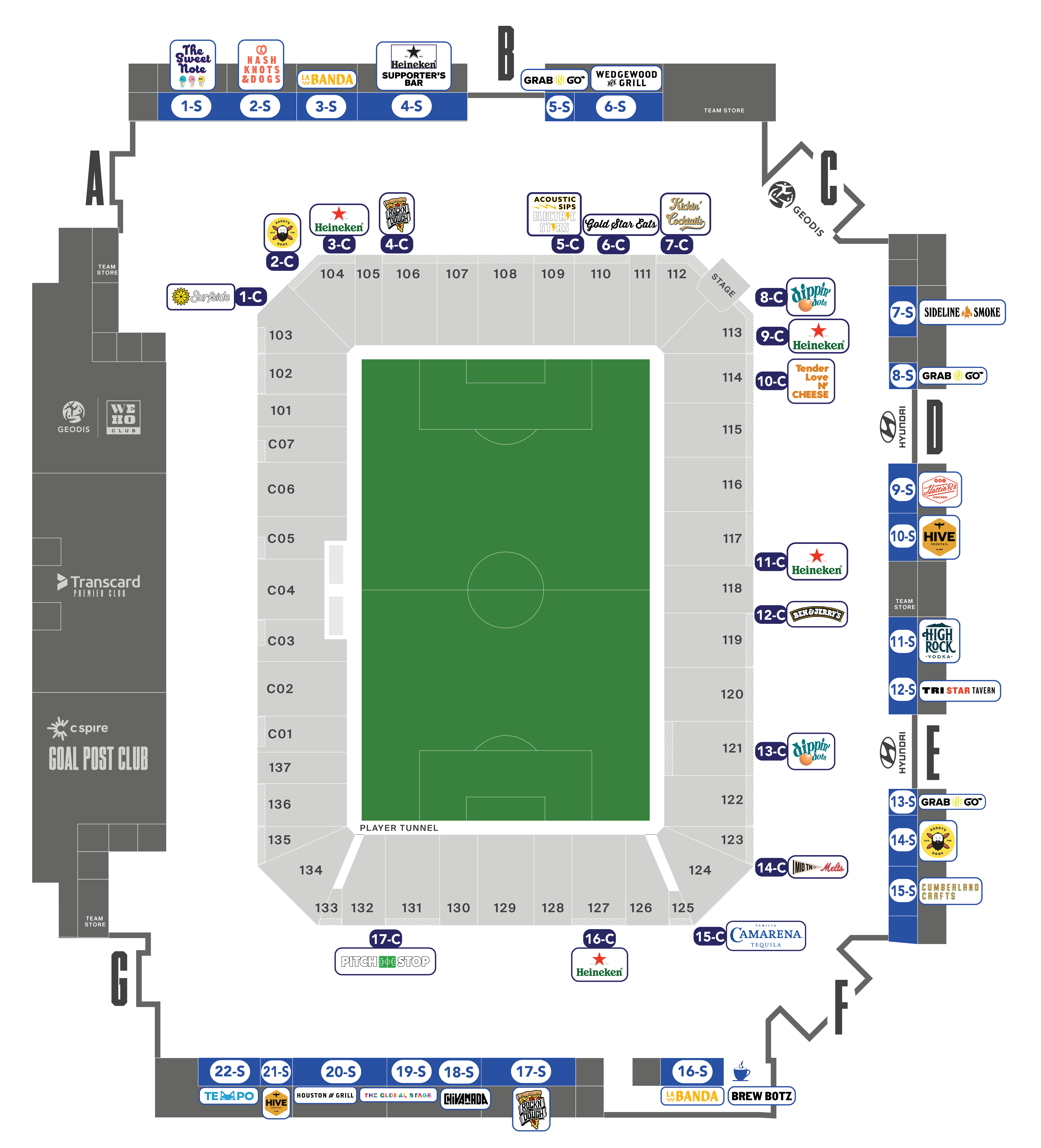 Hot Dog locations can be found behind Sections